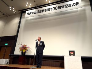 砂栄会会員46社68名をお招きし、当社の役職員100名で日頃の感謝をお伝えするとともに創業から100年の歴史を振り返り、これまで当社を支えて下さいました、お取引先、協力会社、諸先輩方等すべての関係者に感謝する式典となりました。