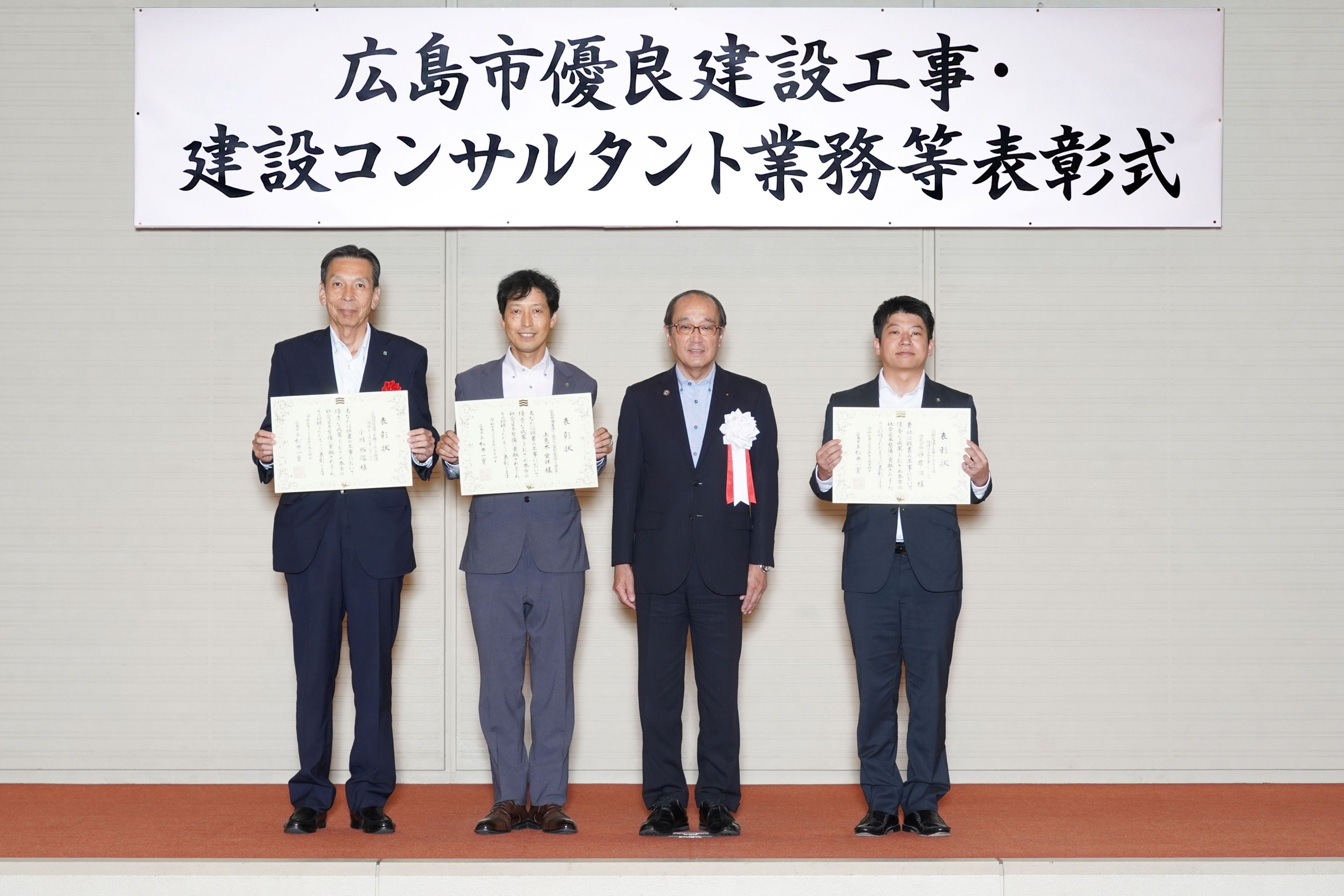広島市優良建設工事等表彰式において当社が施工した工事2件が優良建設工事として表彰され、併せて工事担当者2名も技術者表彰をいただきました。