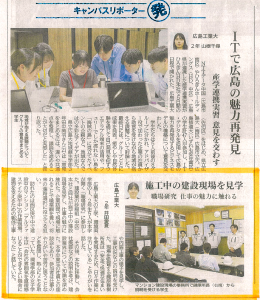 お知らせ 中国新聞朝刊に掲載されました 2025.10.19 広島工業大学「職場研究」参加者の記事が、中国新聞10月19日朝刊「キャンパスリポーター発」として掲載されました。 職場研究の様子はこちらからご覧下さい。 広島工業大学「職場研究」として学生5名を受入