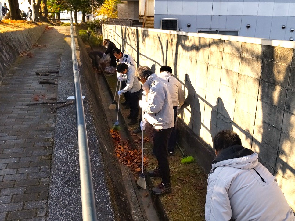平野町町内会清掃が行われ、当社から砂原社長はじめ社員有志13名が参加し主に落葉の溜まった水路を清掃いたしました。